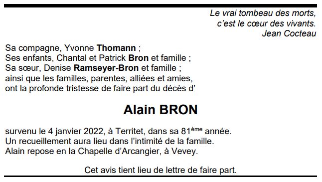 Alain BRON 19 juin. 1941 - 04 jan. 2022 Avis mortuaire PFG Télecharger PDF Partager sur: Galerie PreviousNext PreviousNext