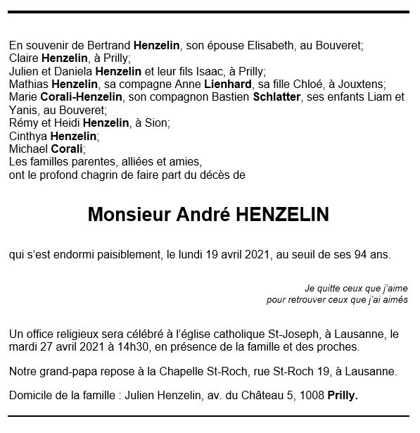 André HENZELIN 21 juin. 1927 - 19 avr. 2021 Avis mortuaire PFG Télecharger PDF Partager sur: Galerie PreviousNext PreviousNext
