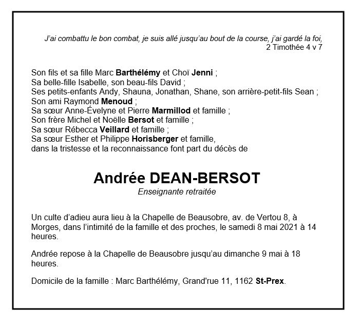 Andrée DEAN-BERSOT 10 juin. 1944 - 03 mai. 2021 Avis mortuaire PFG Télecharger PDF Partager sur: Galerie PreviousNext PreviousNext