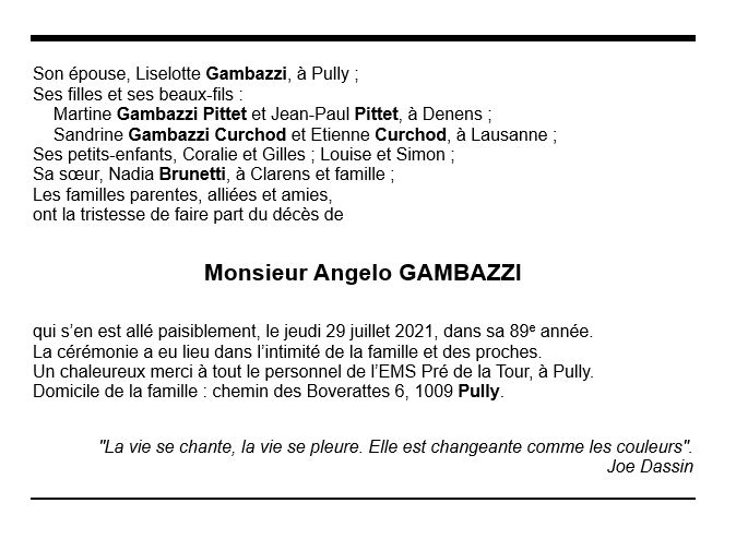 Angelo GAMBAZZI 16 déc. 1932 - 29 juil. 2021 Avis mortuaire PFG Télecharger PDF Partager sur: Galerie PreviousNext PreviousNext