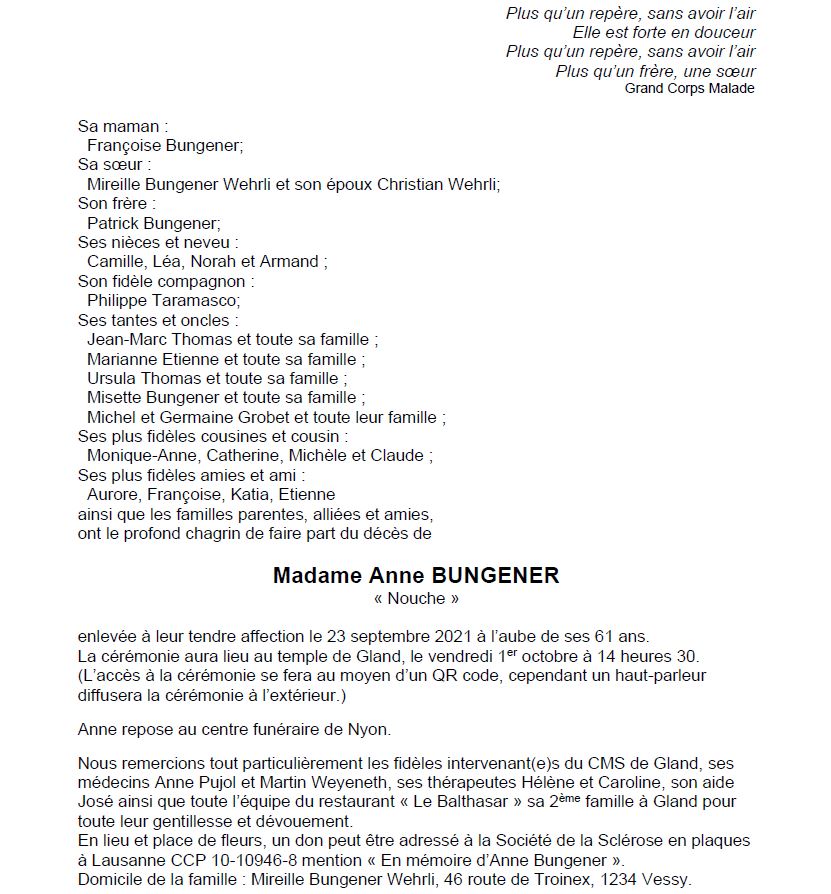 Anne BUNGENER 08 oct. 1960 - 23 sep. 2021 Avis mortuaire PFG Télecharger PDF Partager sur: Galerie PreviousNext PreviousNext