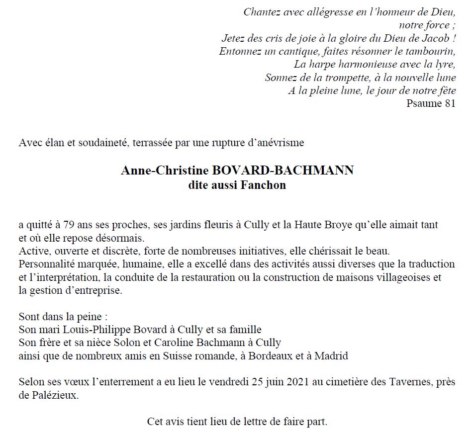 Anne-Christine BOVARD-BACHMANN 02 avr. 1942 - 21 juin. 2021 Avis mortuaire PFG Télecharger PDF Partager sur: Galerie PreviousNext PreviousNext
