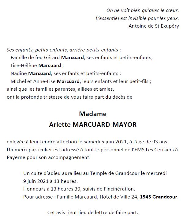 Arlette MARCUARD-MAYOR 01 avr. 1928 - 05 juin. 2021 Avis mortuaire PFG Télecharger PDF Partager sur: Galerie PreviousNext PreviousNext