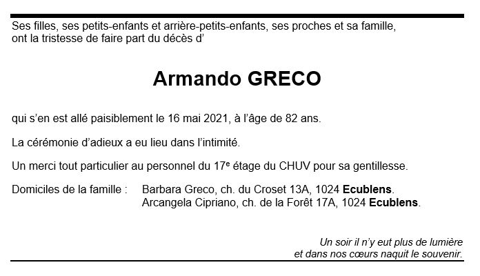 Armando GRECO 09 sep. 1938 - 06 mai. 2021 Avis mortuaire PFG Télecharger PDF Partager sur: Galerie PreviousNext PreviousNext