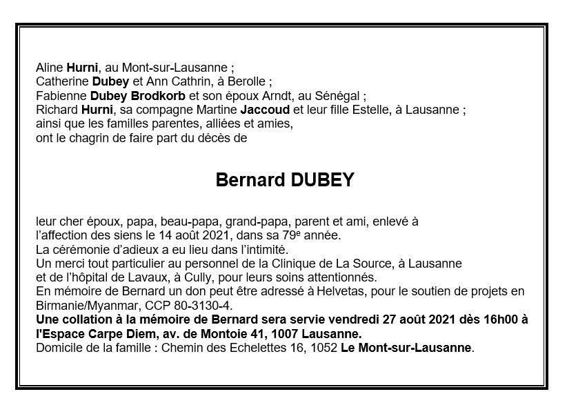 Bernard DUBEY 13 mar. 1943 - 14 aoû. 2021 Avis mortuaire PFG Télecharger PDF Partager sur: Galerie PreviousNext PreviousNext