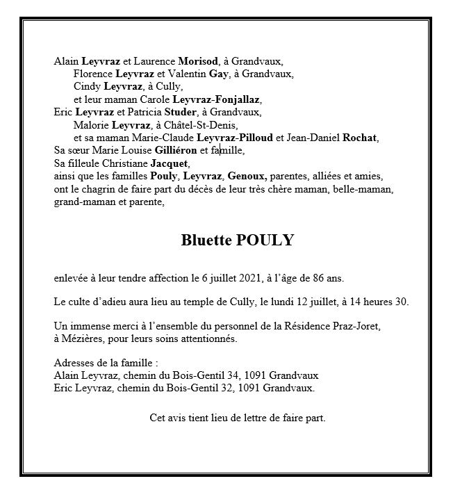 Bluette POULY 04 mar. 1935 - 06 juil. 2021 Avis mortuaire PFG Télecharger PDF Partager sur: Galerie PreviousNext PreviousNext