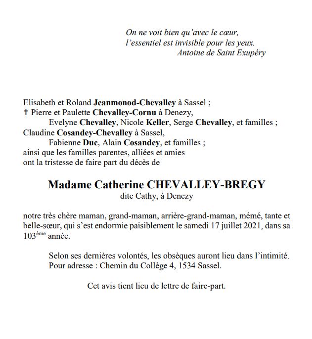 Catherine CHEVALLEY-BREGY 24 mar. 1919 - 17 juil. 2021 Avis mortuaire PFG Télecharger PDF Partager sur: Galerie PreviousNext PreviousNext
