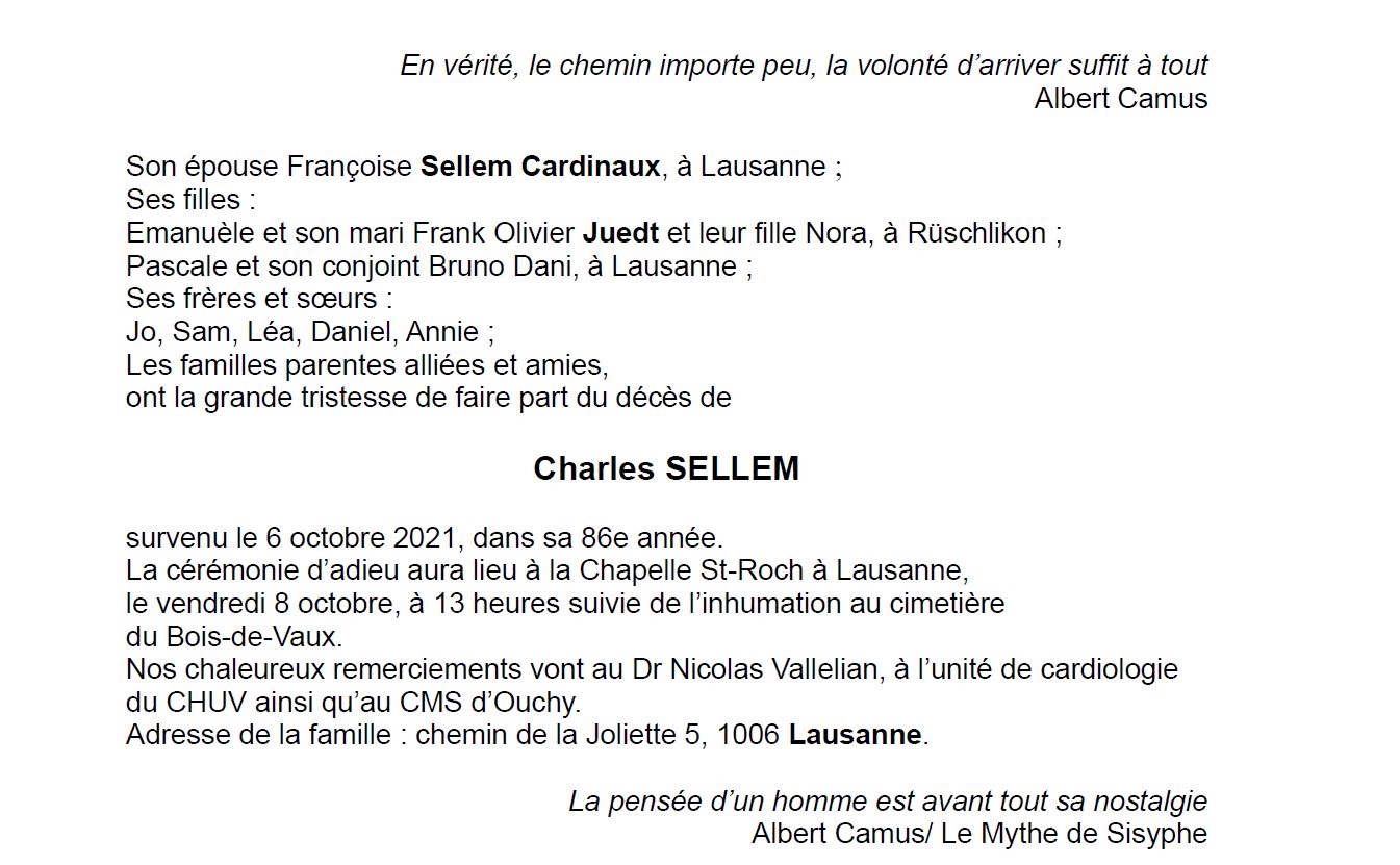 Charles SELLEM 02 déc. 1935 - 06 oct. 2021 Avis mortuaire PFG Télecharger PDF Partager sur: Galerie PreviousNext PreviousNext