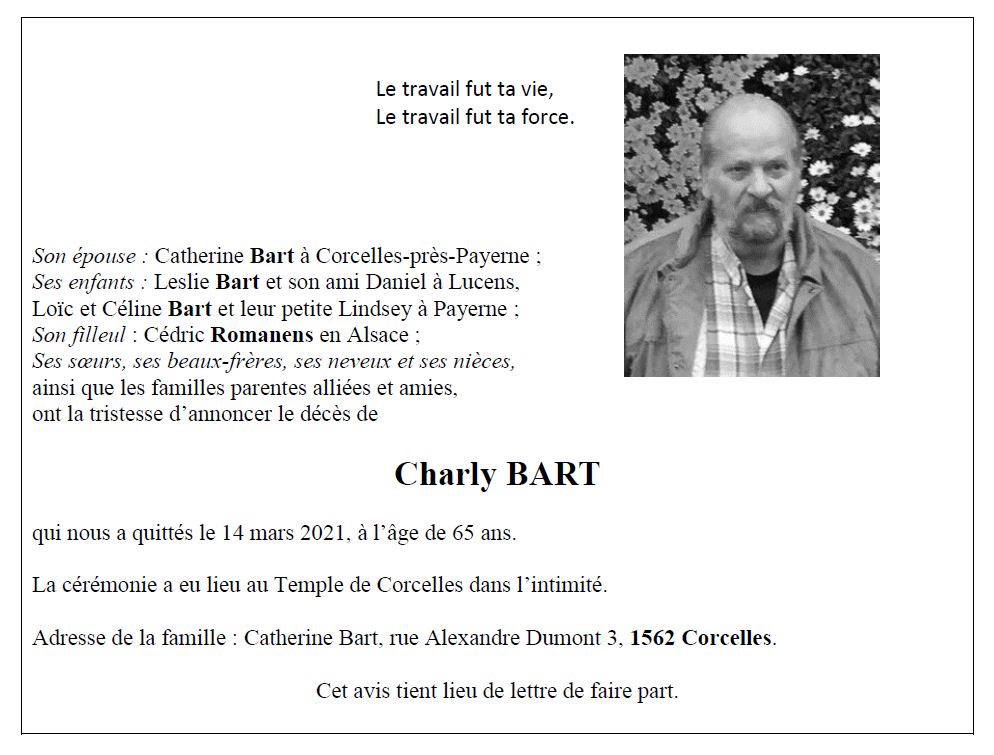 Charly BART 22 juil. 1955 - 14 mar. 2021 Avis mortuaire PFG Télecharger PDF Partager sur: Galerie PreviousNext PreviousNext