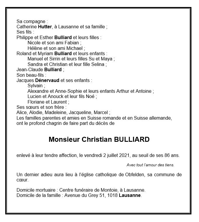 Christian BULLIARD 14 juil. 1935 - 02 juil. 2021 Avis mortuaire PFG Télecharger PDF Partager sur: Galerie PreviousNext PreviousNext