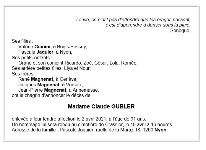 Claude GUBLER 17 mar. 1930 - 02 avr. 2021 Avis mortuaire PFG Télecharger PDF Partager sur: Galerie PreviousNext PreviousNext