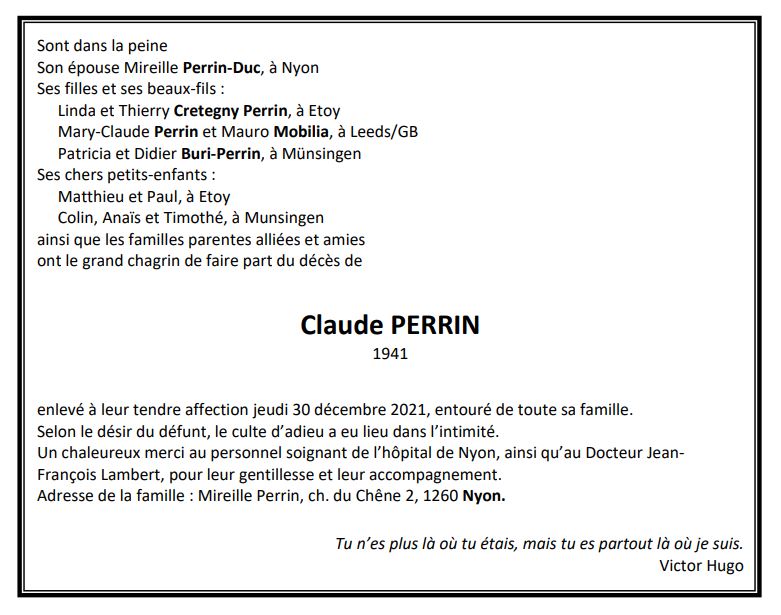 Claude PERRIN 24 nov. 1941 - 31 déc. 2021 Avis mortuaire PFG Télecharger PDF Partager sur: Galerie PreviousNext PreviousNext
