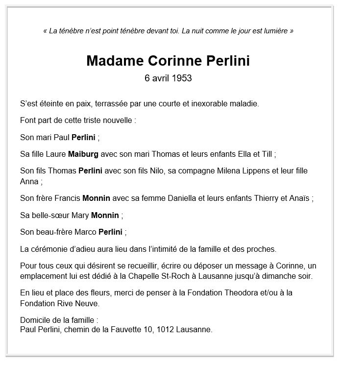 Corinne PERLINI 06 avr. 1953 - 27 avr. 2021 Avis mortuaire PFG Télecharger PDF Partager sur: Galerie PreviousNext PreviousNext