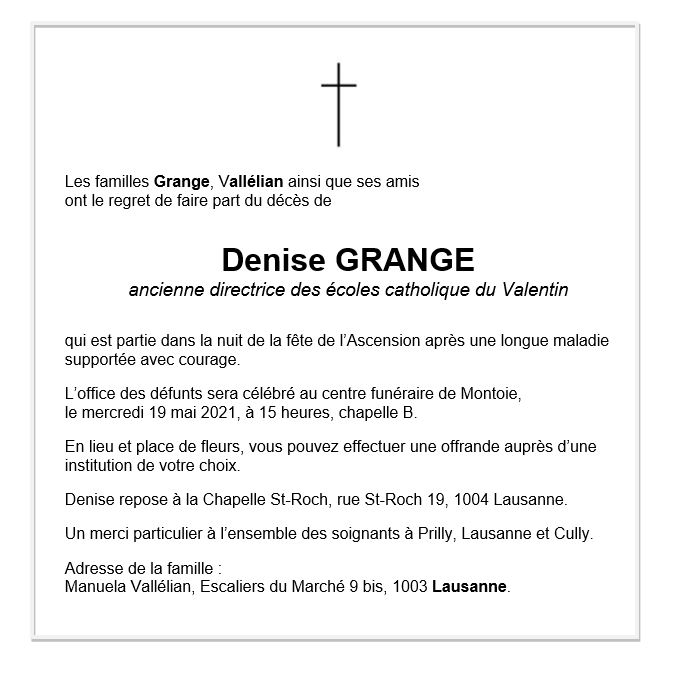 Denise GRANGE 27 fév. 1944 - 13 mai. 2021 Avis mortuaire PFG Télecharger PDF Partager sur: Galerie PreviousNext PreviousNext