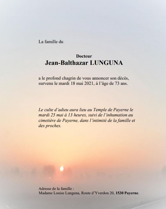 Docteur Jean-Balthazar LUNGUNA 20 déc. 1947 - 18 mai. 2021 Avis mortuaire PFG Télecharger PDF Partager sur: Galerie PreviousNext PreviousNext