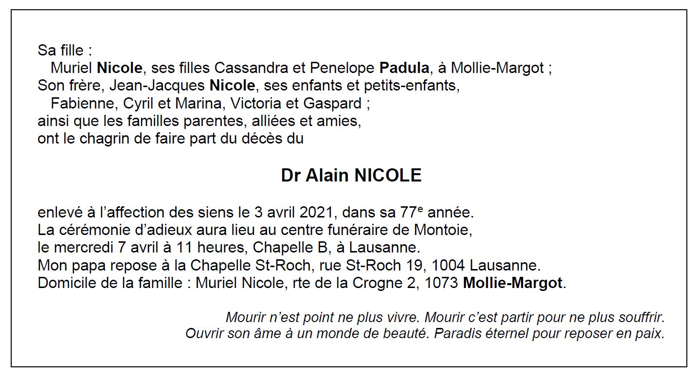 Dr Alain NICOLE 08 aoû. 1944 - 03 avr. 2021 Avis mortuaire PFG Télecharger PDF Partager sur: Galerie PreviousNext PreviousNext
