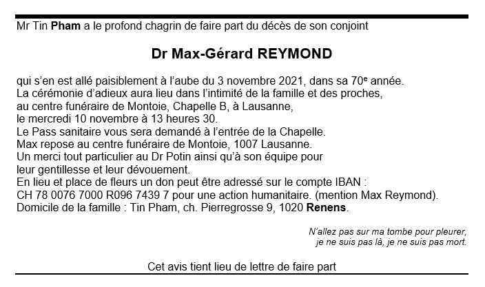 Dr Max-Gérard REYMOND 09 mai. 1952 - 03 nov. 2021 Avis mortuaire PFG Télecharger PDF Partager sur: Galerie PreviousNext PreviousNext