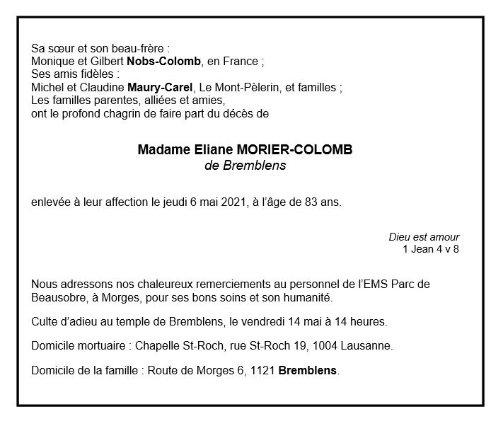 Eliane MORIER-COLOMB 02 juil. 1938 - 05 juin. 2021 Avis mortuaire PFG Télecharger PDF Partager sur: Galerie PreviousNext PreviousNext