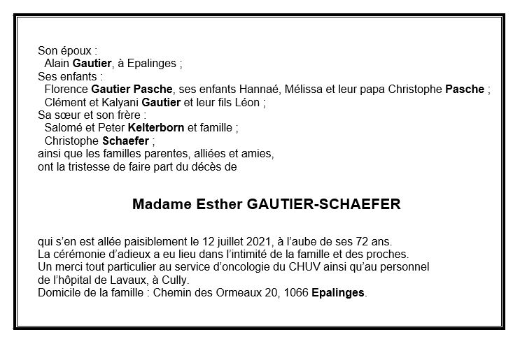 Esther GAUTIER-SCHAEFER 18 juil. 1949 - 12 juil. 2021 Avis mortuaire PFG Télecharger PDF Partager sur: Galerie PreviousNext PreviousNext