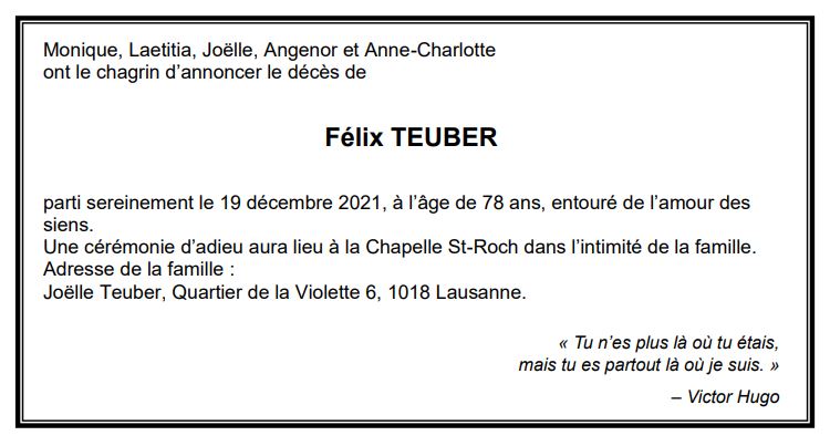 Félix TEUBER 25 oct. 1943 - 20 déc. 2021 Avis mortuaire PFG Télecharger PDF Partager sur: Galerie PreviousNext PreviousNext
