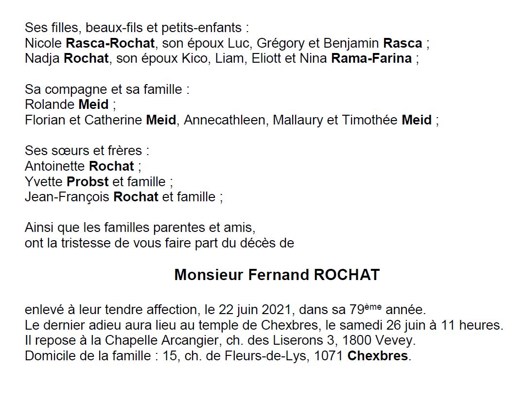 Fernand Rochat 05 juin. 1943 - 22 juin. 2021 Avis mortuaire PFG Télecharger PDF Partager sur: Galerie PreviousNext PreviousNext