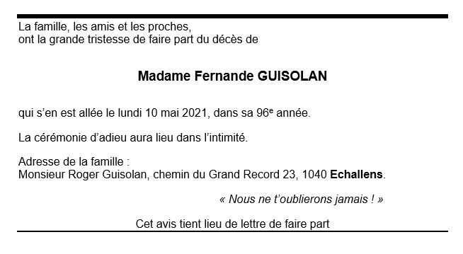 Fernande GUISOLAN 15 nov. 1925 - 10 mai. 2021 Avis mortuaire PFG Télecharger PDF Partager sur: Galerie PreviousNext PreviousNext