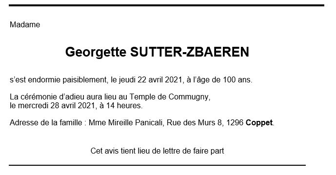 Georgette SUTTER-ZBAEREN 17 avr. 1921 - 22 avr. 2021 Avis mortuaire PFG Télecharger PDF Partager sur: Galerie PreviousNext PreviousNext