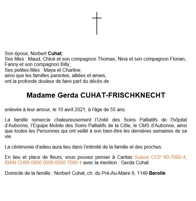 Gerda CUHAT-FRISCHKNECHT 16 mar. 1966 - 10 avr. 2021 Avis mortuaire PFG Télecharger PDF Partager sur: Galerie PreviousNext PreviousNext