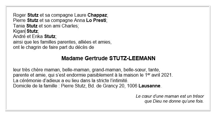 Gertrude STUTZ-LEEMANN 06 déc. 1928 - 01 avr. 2021 Avis mortuaire PFG Télecharger PDF Partager sur: Galerie PreviousNext PreviousNext