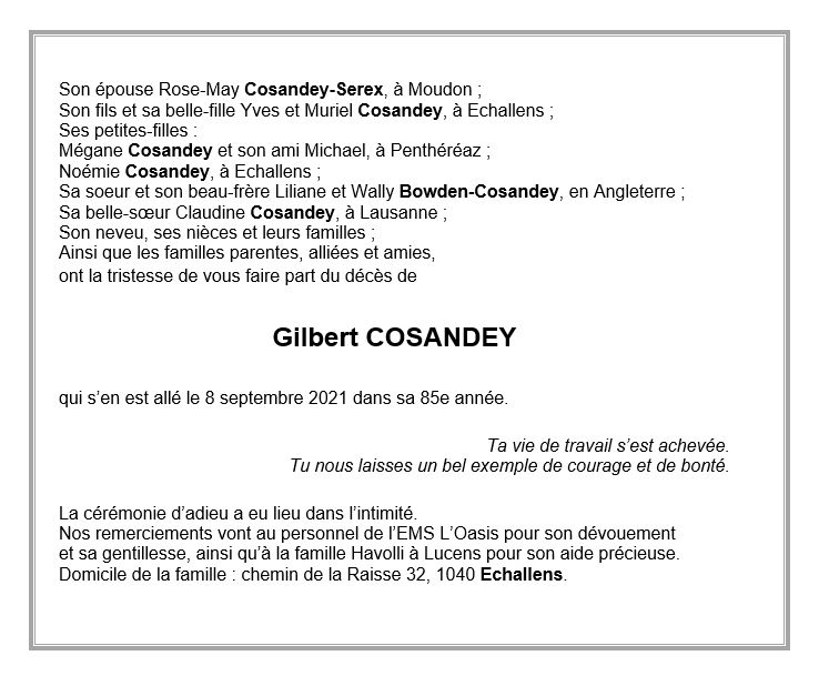Gilbert COSANDEY 25 nov. 1936 - 08 sep. 2021 Avis mortuaire PFG Télecharger PDF Partager sur: Galerie PreviousNext PreviousNext