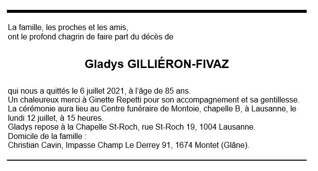 Gladys GILLIÉRON 05 mar. 1936 - 06 juil. 2021 Avis mortuaire PFG Télecharger PDF Partager sur: Galerie PreviousNext PreviousNext