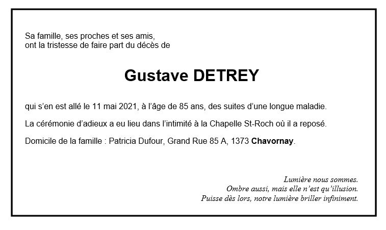 Gustave DETREY 01 avr. 1936 - 11 mai. 2021 Avis mortuaire PFG Télecharger PDF Partager sur: Galerie PreviousNext PreviousNext