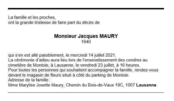 Jacques MAURY 11 fév. 1940 - 14 juil. 2021 Avis mortuaire PFG Télecharger PDF Partager sur: Galerie PreviousNext PreviousNext