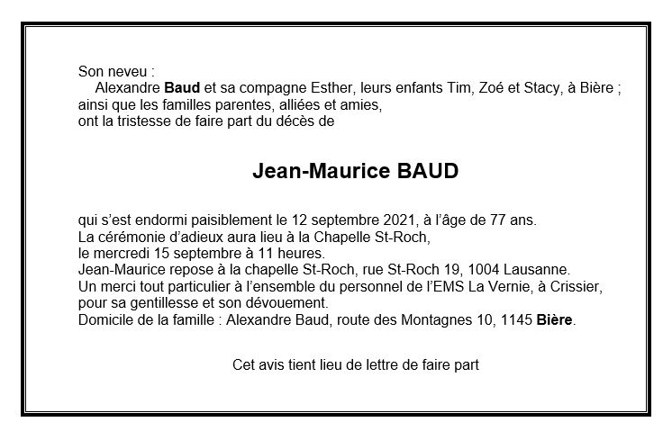 Jean-Maurice BAUD 28 mai. 1944 - 12 sep. 2021 Avis mortuaire PFG Télecharger PDF Partager sur: Galerie PreviousNext PreviousNext