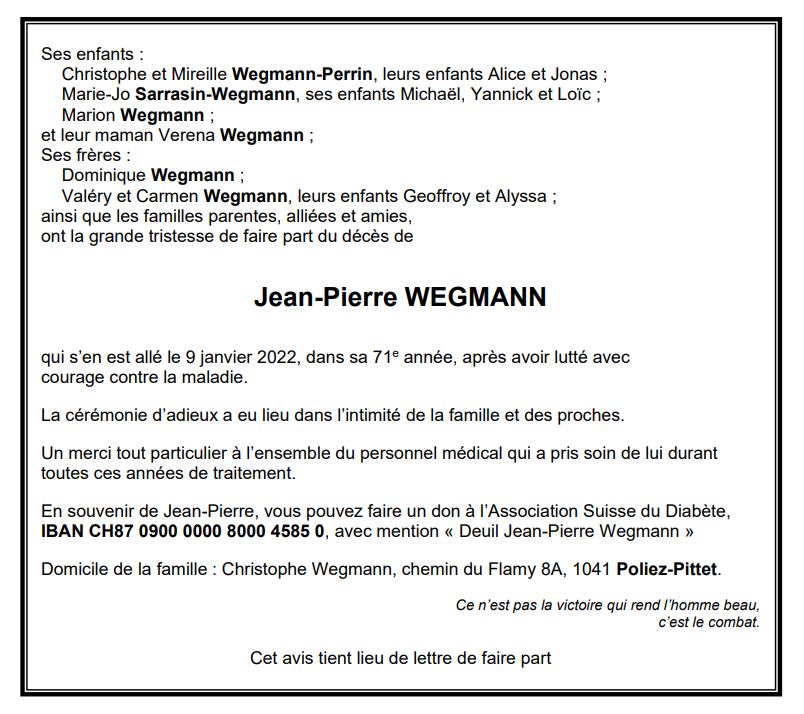 Jean-Pierre WEGMANN 24 sep. 1951 - 09 jan. 2022 Avis mortuaire PFG Télecharger PDF Partager sur: Galerie PreviousNext PreviousNext