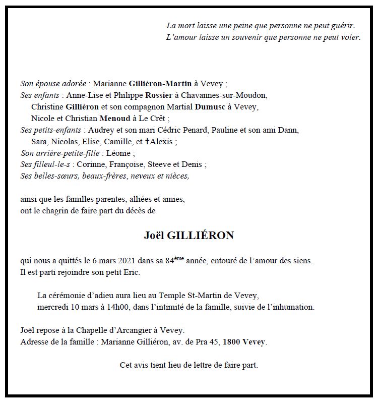 Joël GILLIÉRON 28 juin. 1937 - 06 mar. 2021 Avis mortuaire PFG Télecharger PDF Partager sur: Galerie PreviousNext PreviousNext
