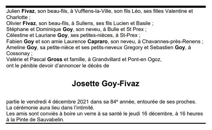 Josette Goy-Fivaz 14 oct. 1938 - 04 déc. 2021 Avis mortuaire PFG Télecharger PDF Partager sur: Galerie PreviousNext PreviousNext