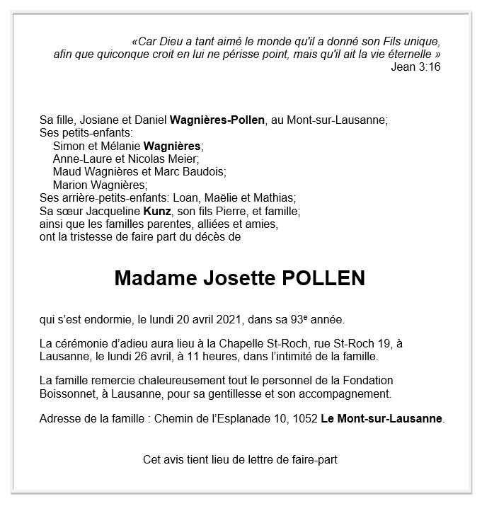 Josette POLLEN 17 juil. 1928 - 20 avr. 2021 Avis mortuaire PFG Télecharger PDF Partager sur: Galerie PreviousNext PreviousNext