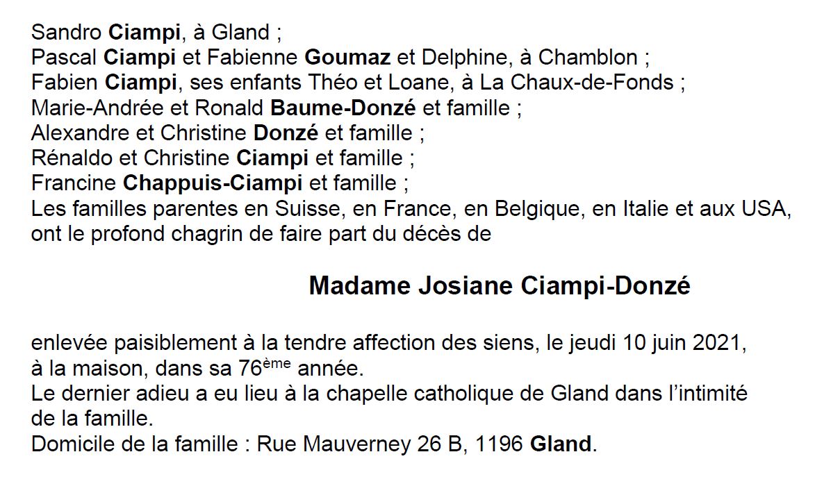 Josiane Ciampi-Donzé 11 sep. 1945 - 10 juin. 2021 Avis mortuaire PFG Télecharger PDF Partager sur: Galerie PreviousNext PreviousNext