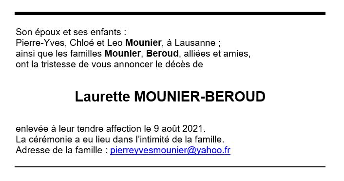 Laurette MOUNIER-BEROUD 09 juil. 1976 - 09 aoû. 2021 Avis mortuaire PFG Télecharger PDF Partager sur: Galerie PreviousNext PreviousNext