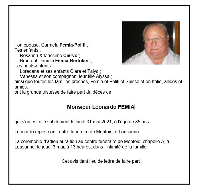 Leonardo FEMIA 30 mai. 1936 - 31 mai. 2021 Avis mortuaire PFG Télecharger PDF Partager sur: Galerie PreviousNext PreviousNext