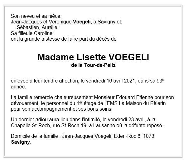 Lisette VOEGELI 23 fév. 1929 - 16 avr. 2021 Avis mortuaire PFG Télecharger PDF Partager sur: Galerie PreviousNext PreviousNext