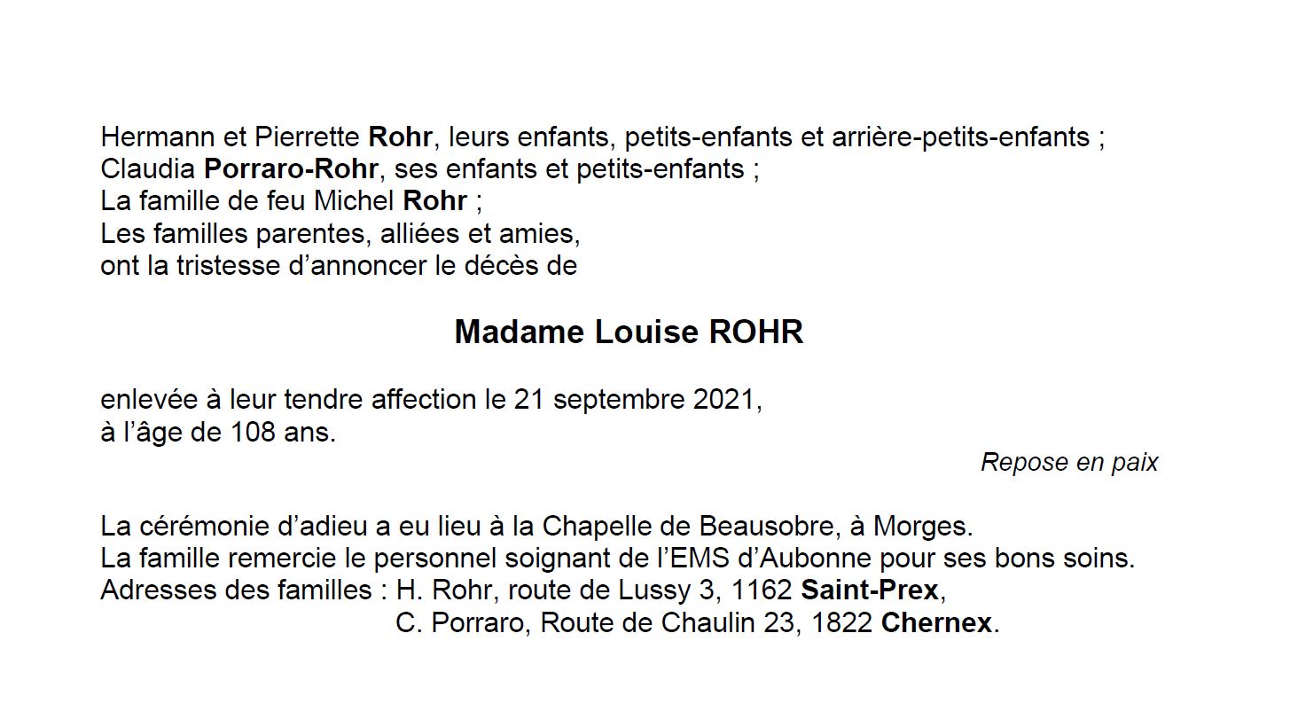 Louise ROHR 12 aoû. 1913 - 21 sep. 2021 Avis mortuaire PFG Télecharger PDF Partager sur: Galerie PreviousNext PreviousNext