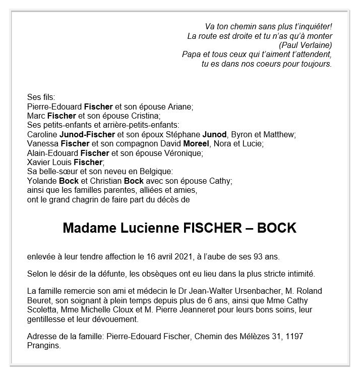 Lucienne FISCHER - BOCK 23 mai. 1928 - 16 avr. 2021 Avis mortuaire PFG Télecharger PDF Partager sur: Galerie PreviousNext PreviousNext