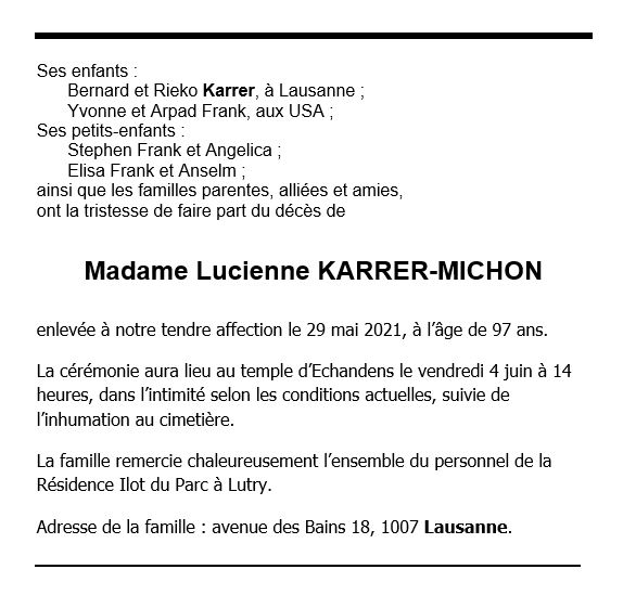 Lucienne KARRER-MICHON 02 jan. 1924 - 29 mai. 2021 Avis mortuaire PFG Télecharger PDF Partager sur: Galerie PreviousNext PreviousNext