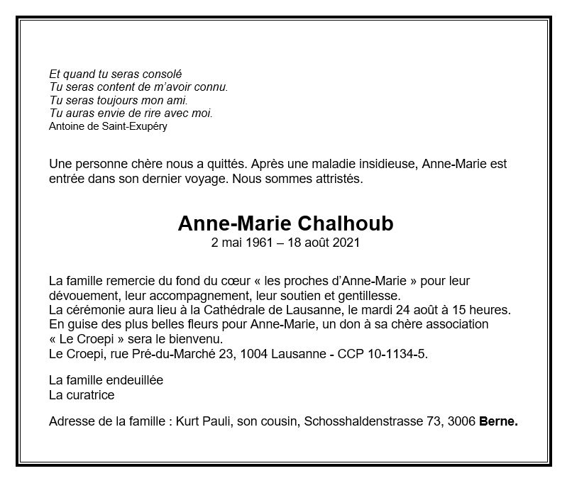 Madame Anne-Marie CHALHOUB 02 mai. 1961 - 18 aoû. 2021 Avis mortuaire PFG Télecharger PDF Partager sur: Galerie PreviousNext PreviousNext