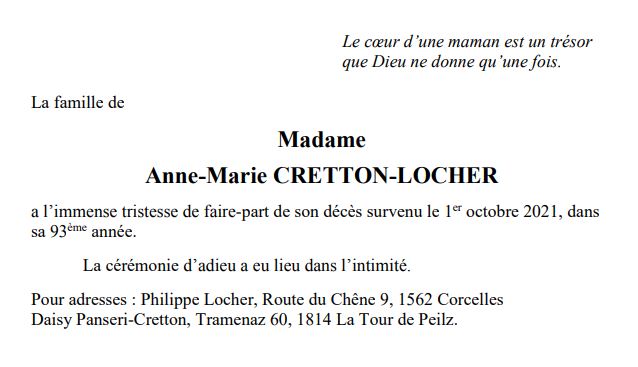 Madame Anne-Marie CRETTON-LOCHER 27 déc. 1928 - 01 oct. 2021 Avis mortuaire PFG Télecharger PDF Partager sur: Galerie