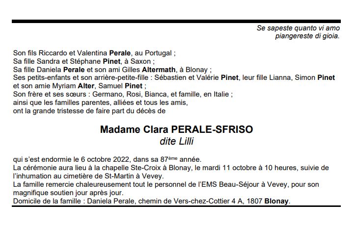 Madame Clara PERALE-SFRISO 13 fév. 1936 - 06 oct. 2022 Avis mortuaire PFG Télecharger PDF Partager sur: Galerie PreviousNext PreviousNext
