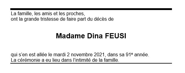 Madame Dina FEUSI 14 jan. 1931 - 02 nov. 2021 Avis mortuaire PFG Télecharger PDF Partager sur: Galerie PreviousNext PreviousNext