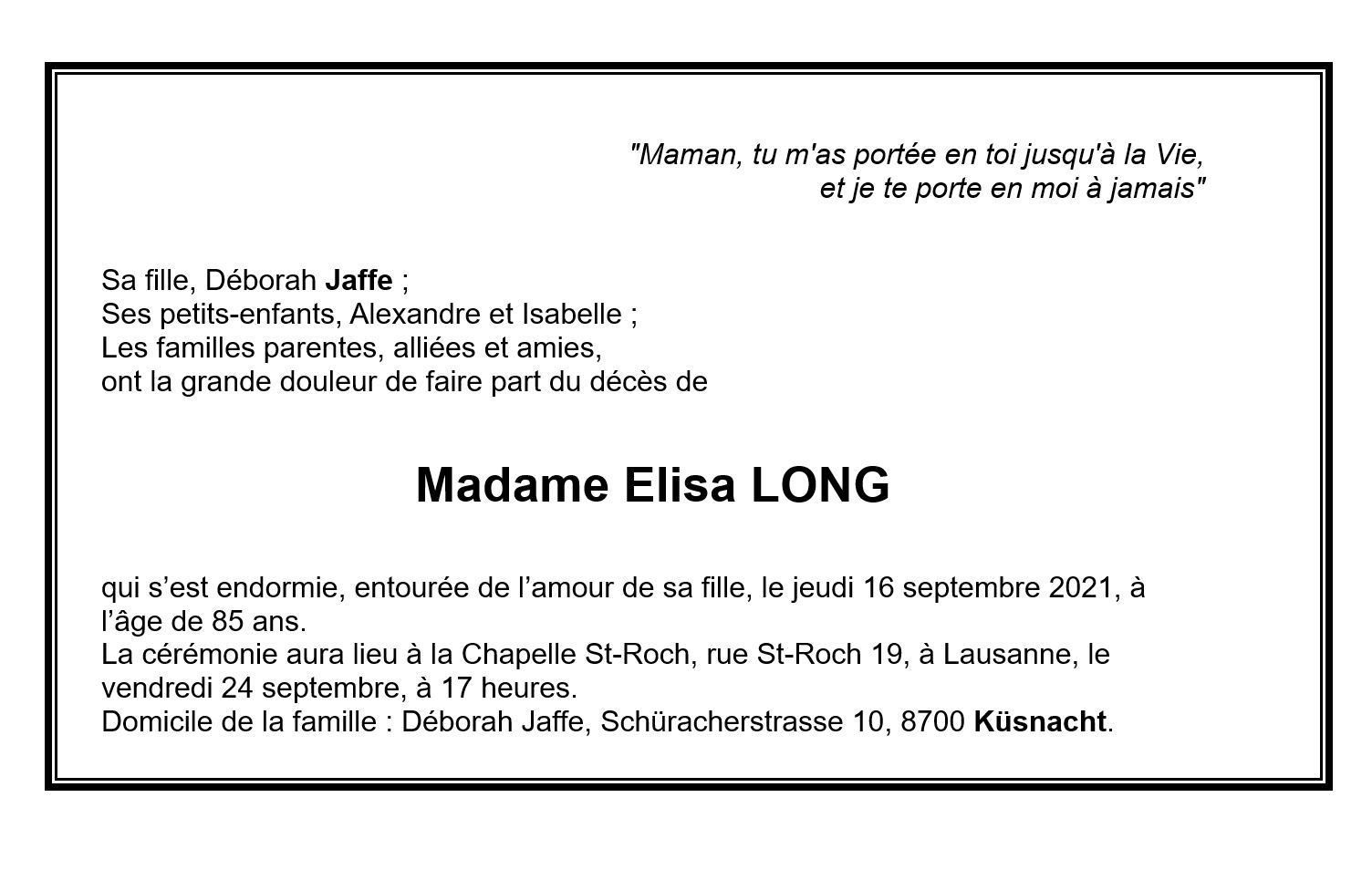 Madame Elisa LONG 10 sep. 1936 - 16 sep. 2021 Avis mortuaire PFG Télecharger PDF Partager sur: Galerie PreviousNext PreviousNext